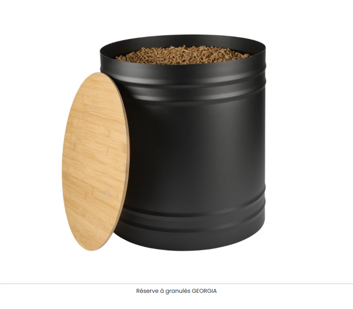 La réserve à granulés Georgia signée DIXNEUF s’inspire des grands barils métalliques pour offrir une solution de stockage à la fois pratique et design. Son style brut et épuré, associé à un couvercle en bambou naturel, apporte une touche chaleureuse et contemporaine à votre espace poêle.